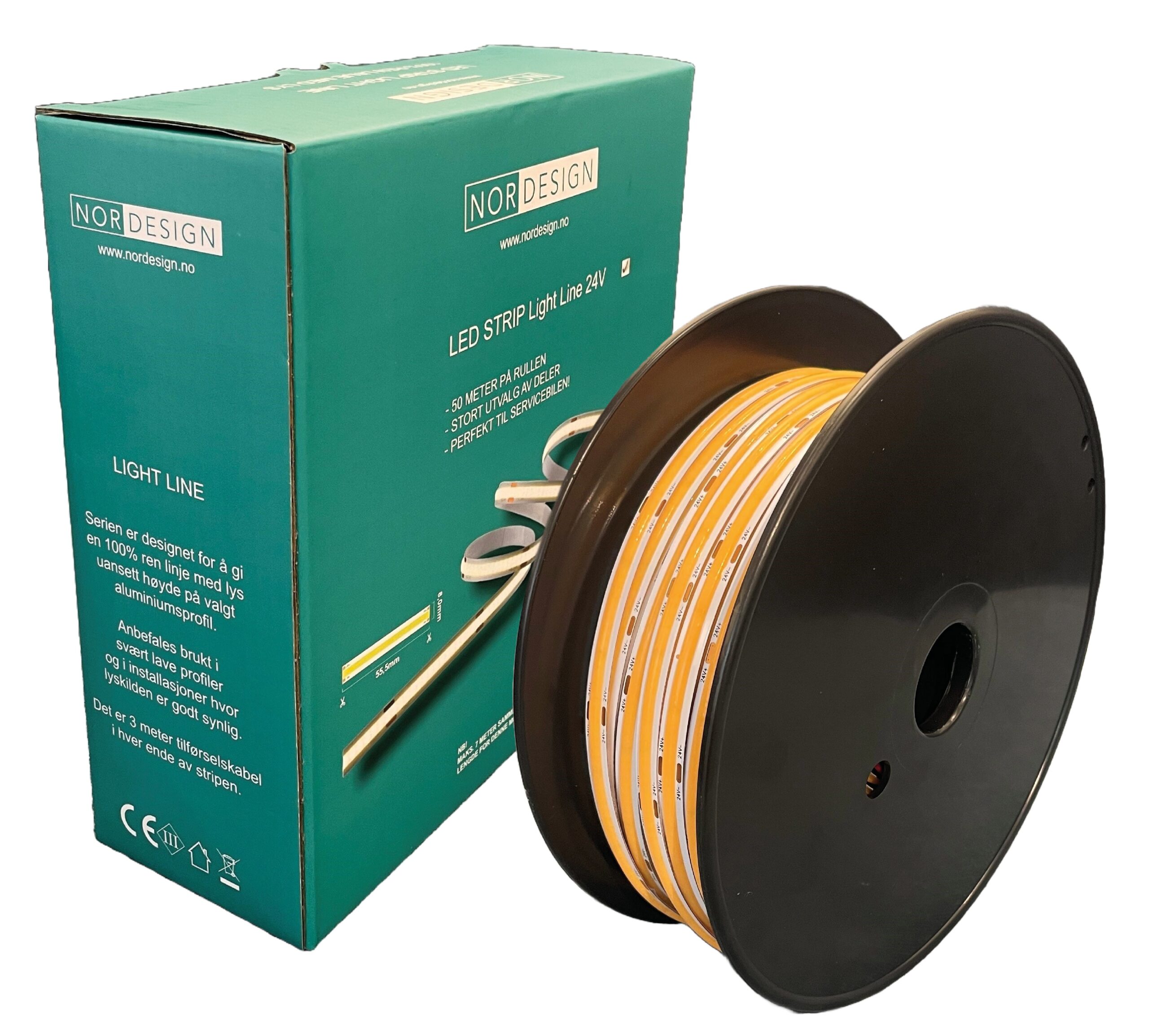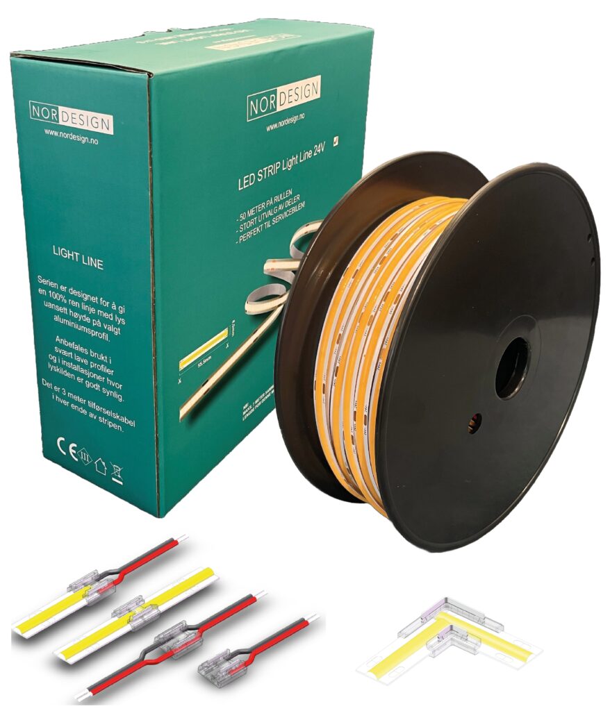 Leveres i boks hvor LED-Stripen ligger på trommel. Trekk enkelt ut ønsket lengde og klipp av. Tilgjengelig i 24V og 48V, hvor man kan gå opp mot 15m sammenhengende strekk. Begge modellene kommer i utførelsen Light Line, som gir 100% ren linje med lys. Passer utmerket i lavtbyggende alu. profiler.