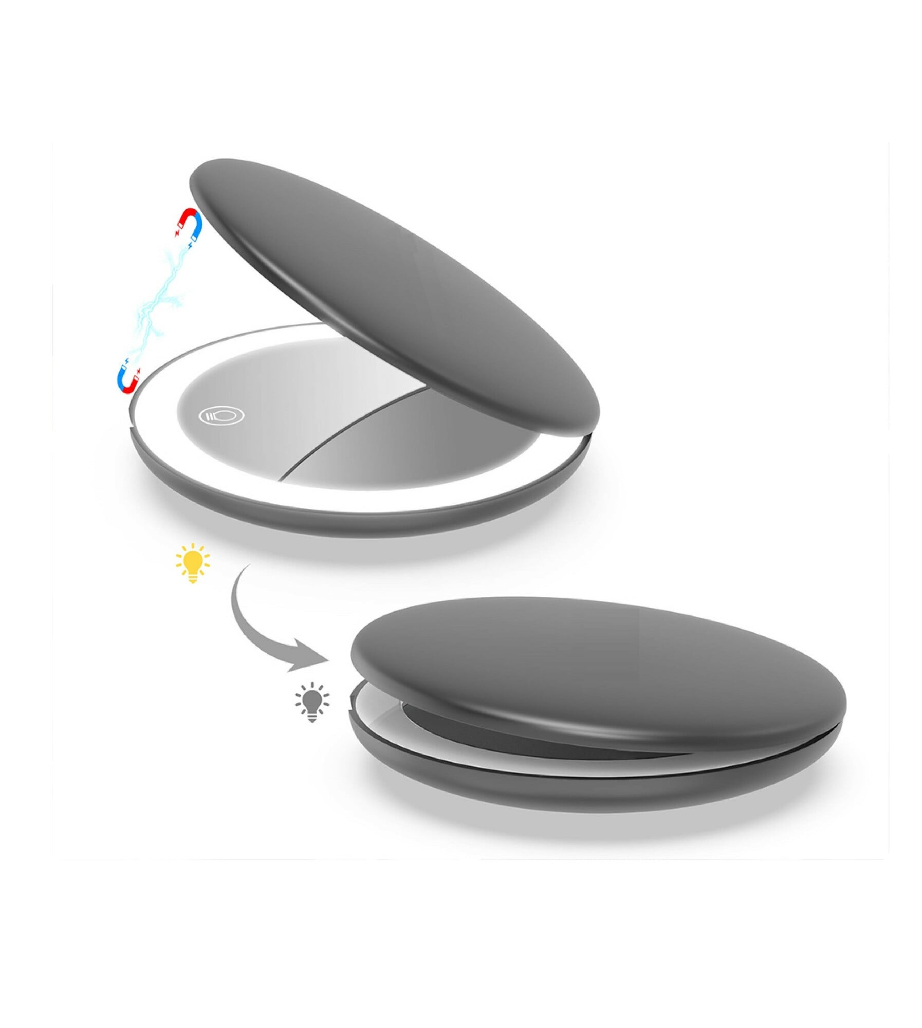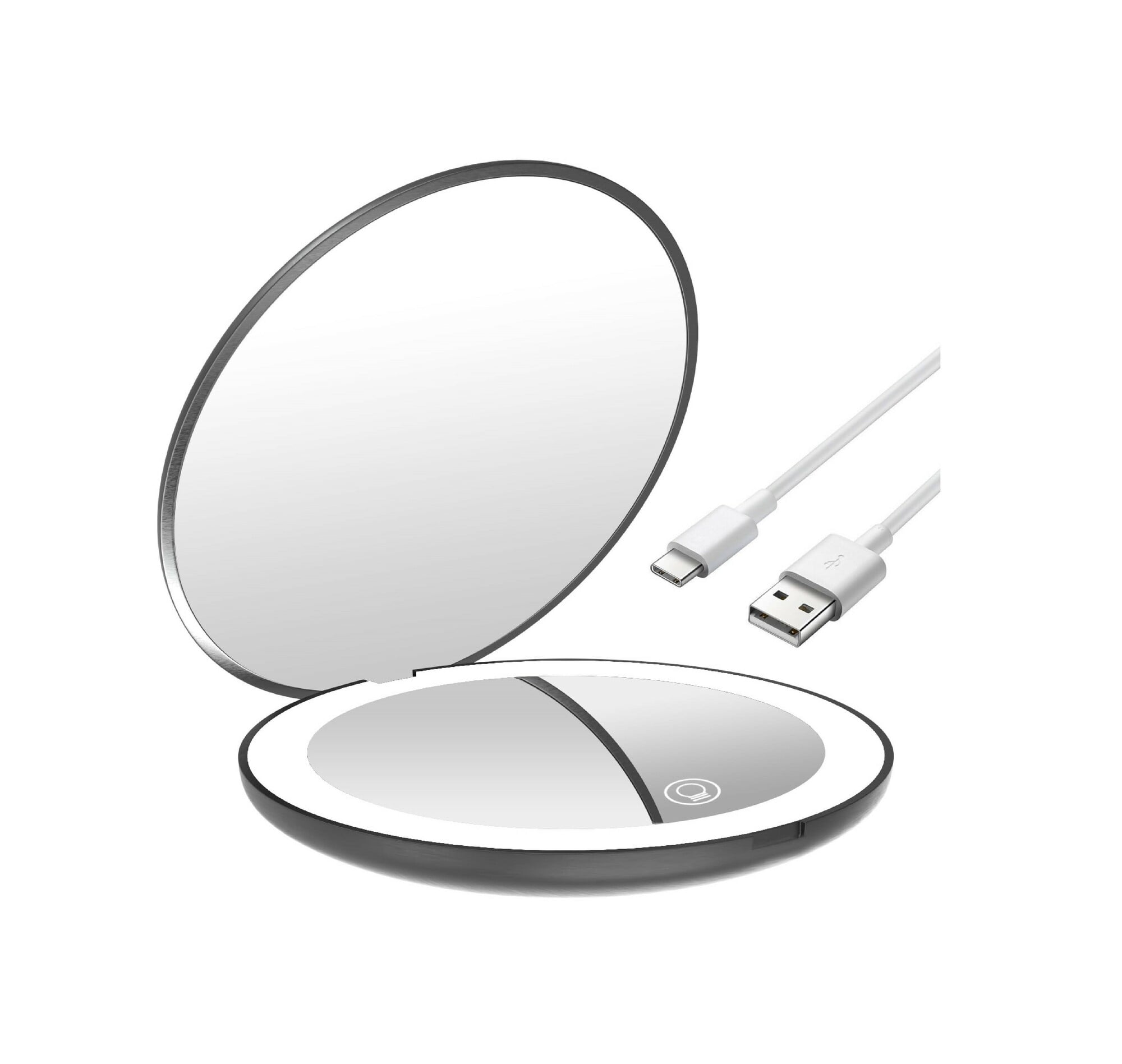 Delikat og lite håndholdt sminkespeil med oppladbart lys. Touch-bryter for av/på, valg av fargetemperatur på lyset og trinnløs dimming. Lyset slukkes automatisk når sminkespeilet lukkes. Inkl. USB C ledning.
