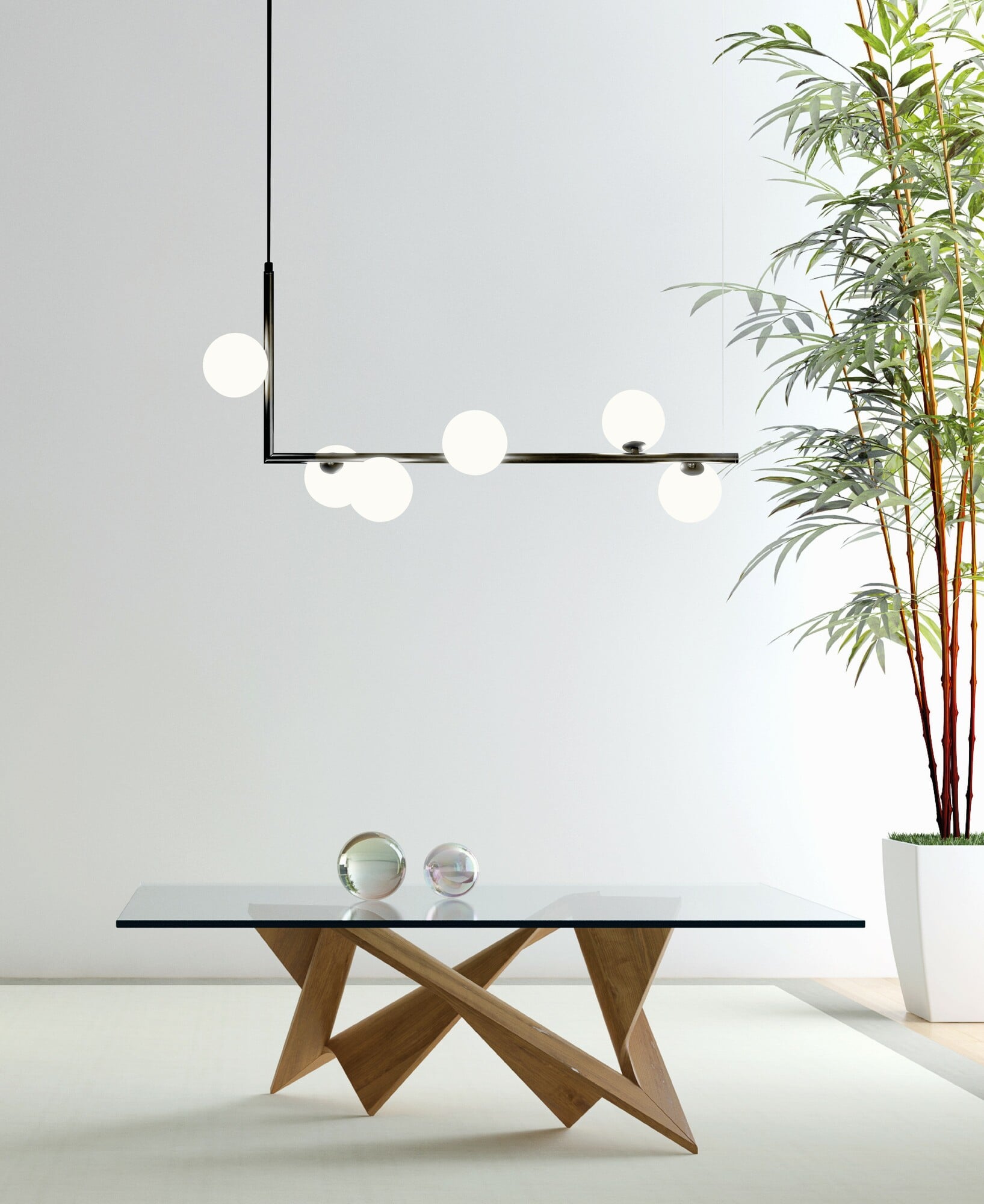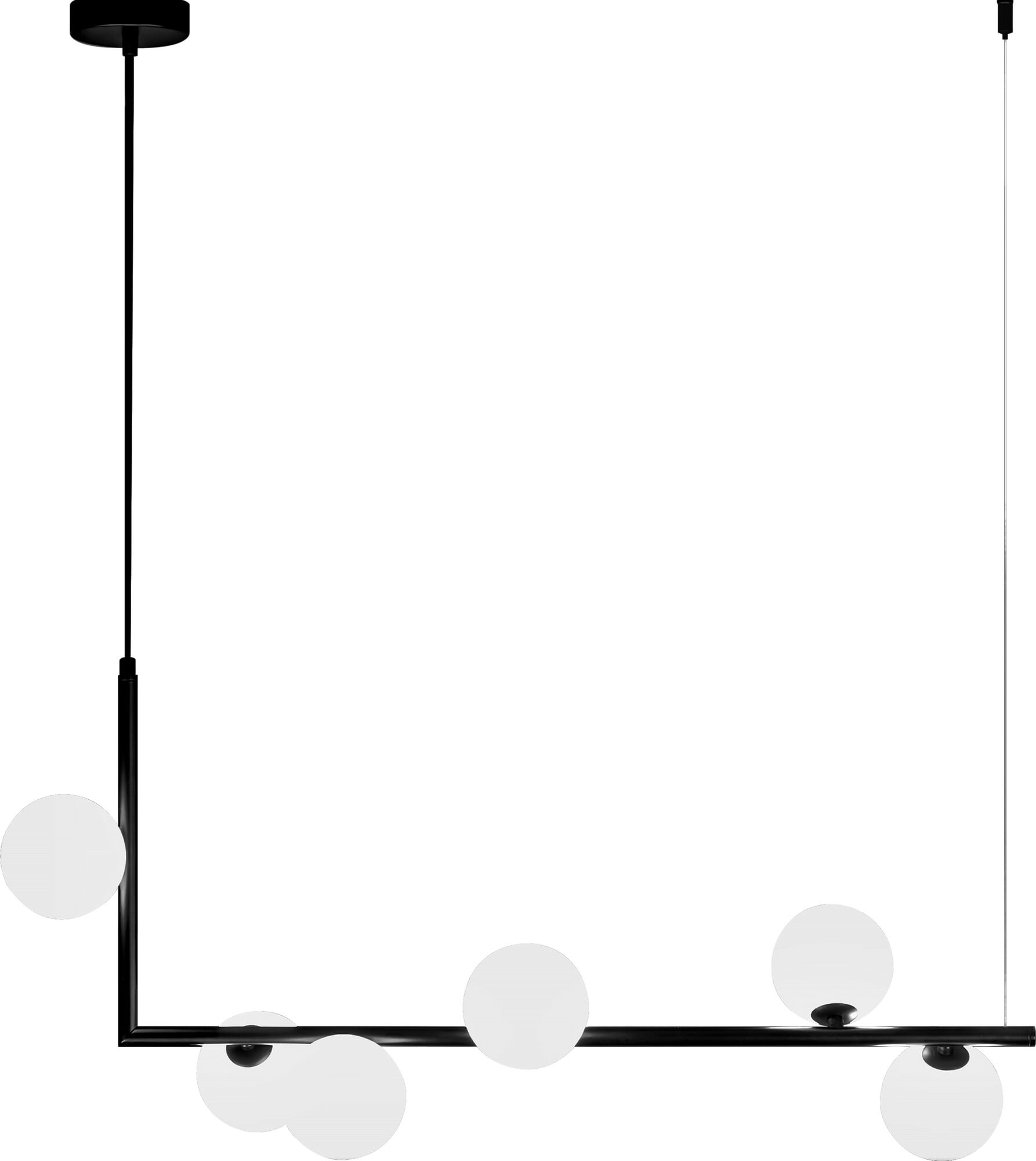 Emrik G9 er en stilig pendel i avlangt design med sort utførelse og med hvite glasskupler. Glasskuplene lyser perfekt og gir et vakkert design. Dimbar avhengig av valgt lyskilde (G9).