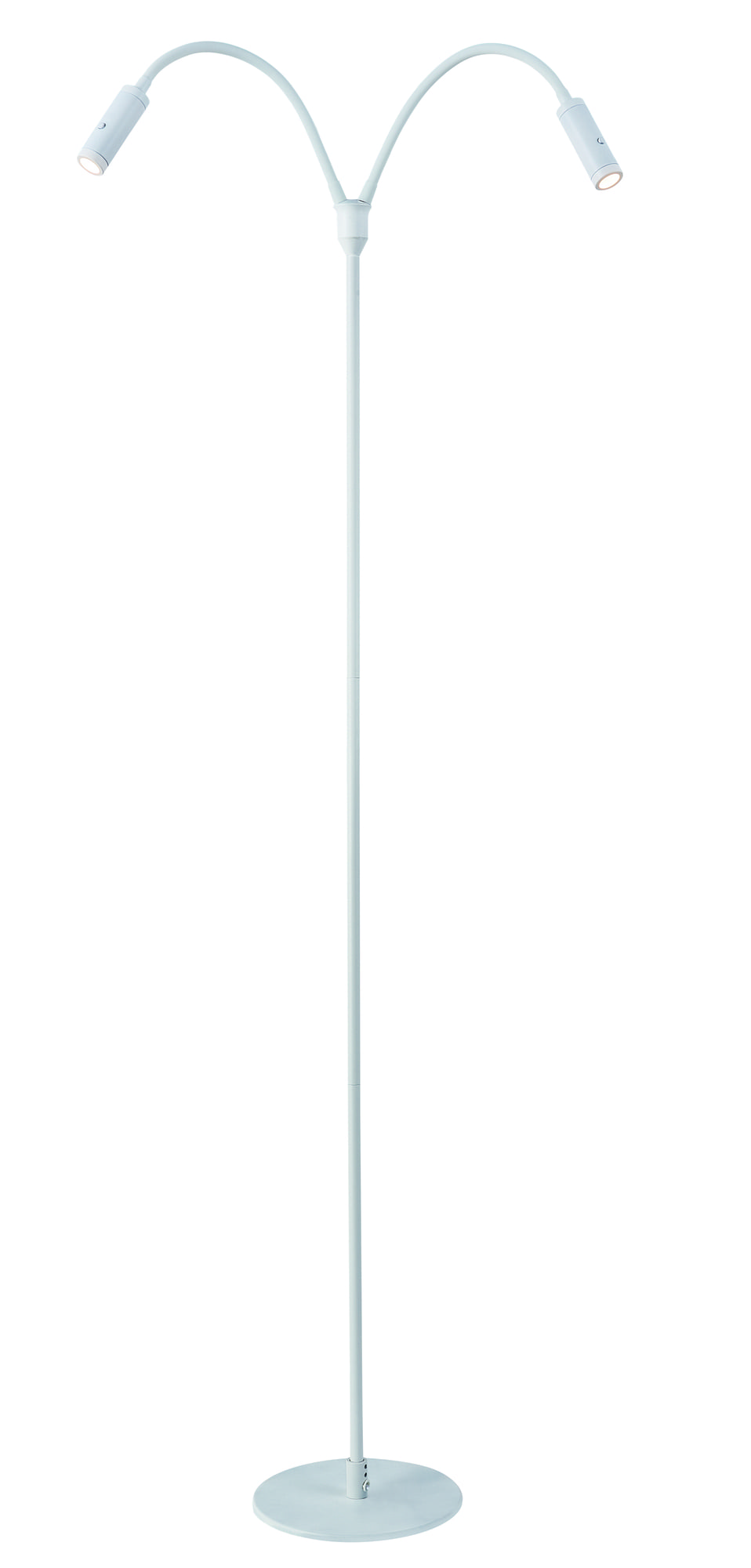 Gulvlampe med to lys. Push-dimmer på lampehodene. Armene er fleksibel og kan bøyes i alle retninger.