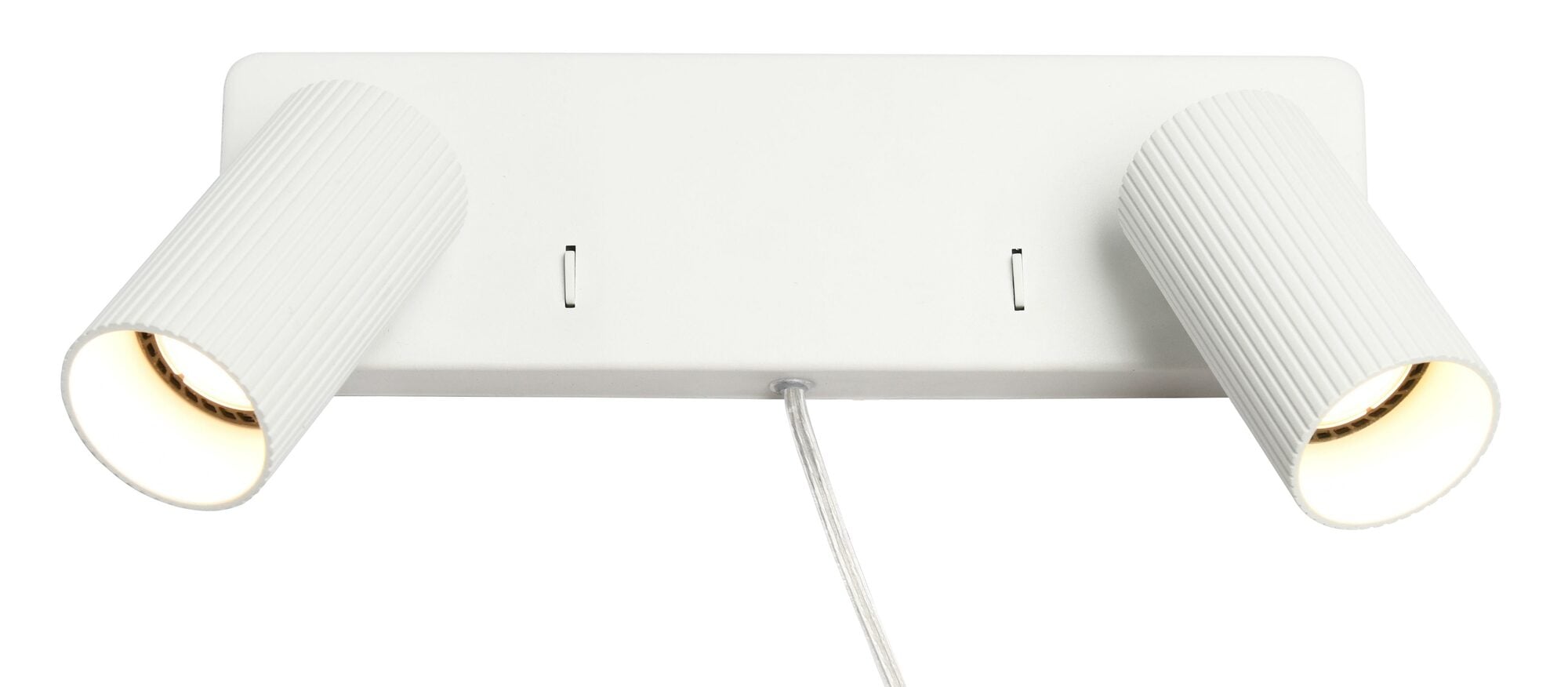 Grooves K2 er en vegglampe som leveres med 2,5m påmontert ledning. Av-/på-bryter integrert på lampen. Lampehodene kan tiltes og roteres.