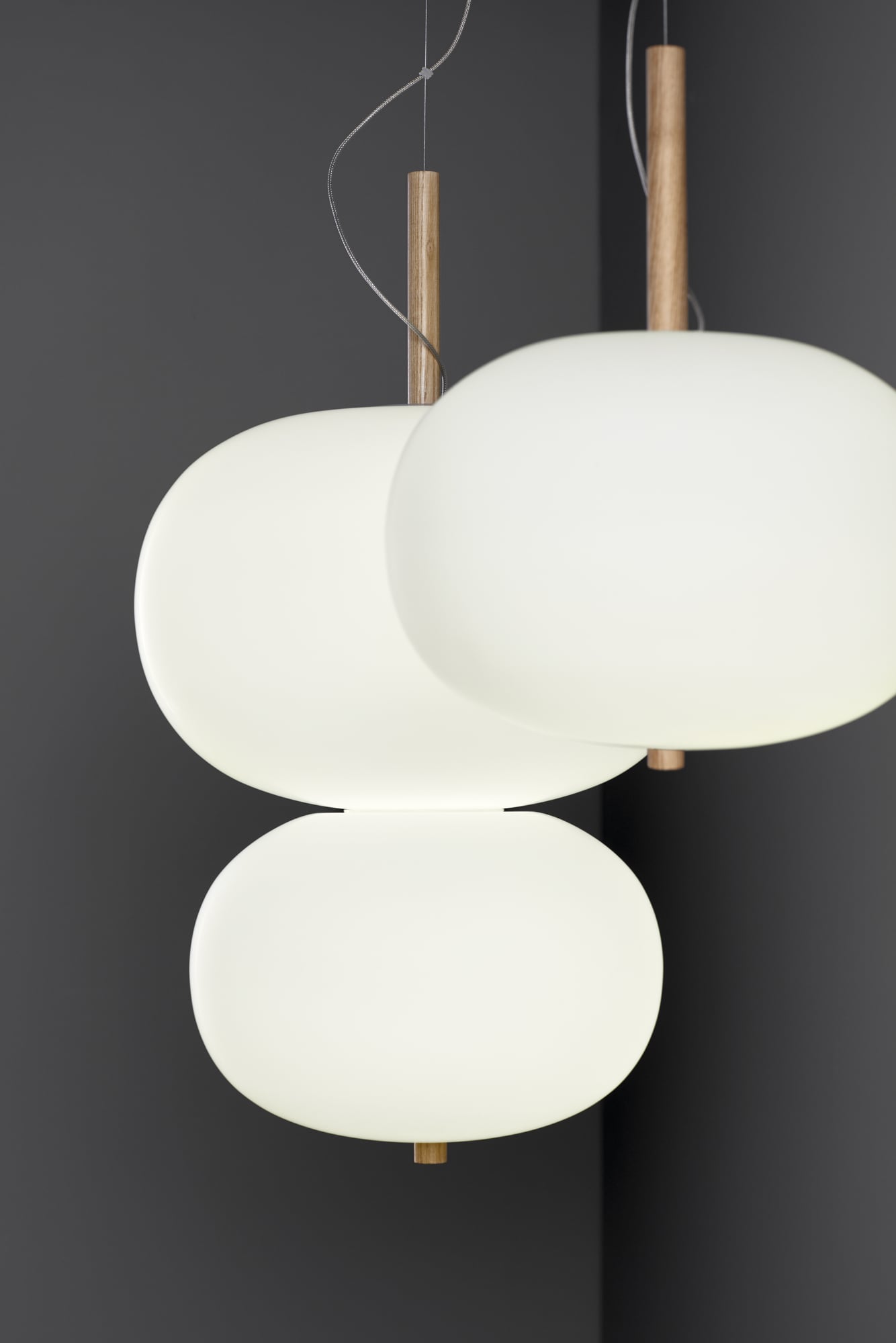 This light, which evokes the «moon» in Basque, has a subtle and minimalist design, comprising a wooden rod inserted into a handblown glass ball. Reminiscent of an artistic sculpture, the light hangs in the air, and the combination of two sizes of glass creates a double suspension.