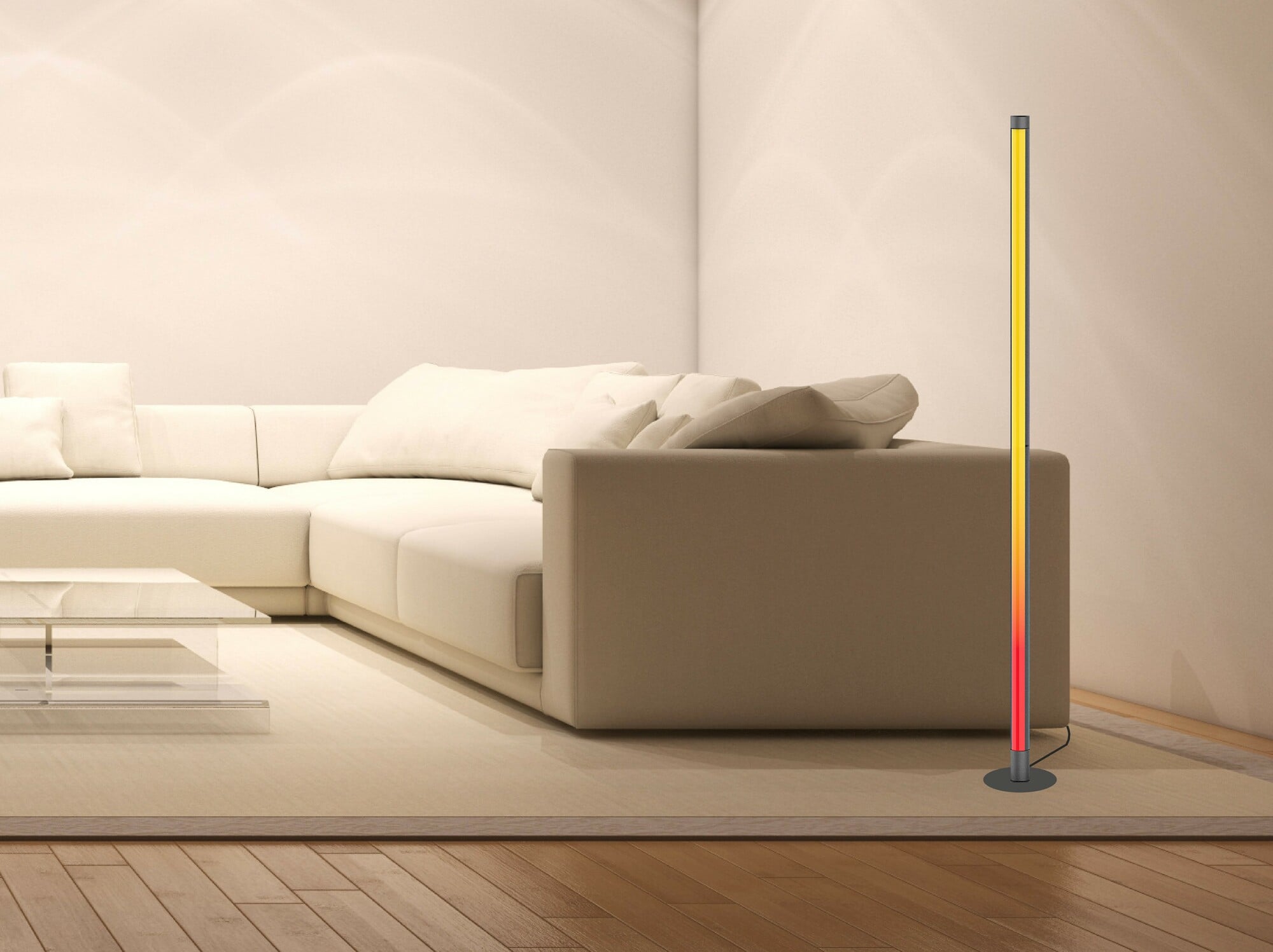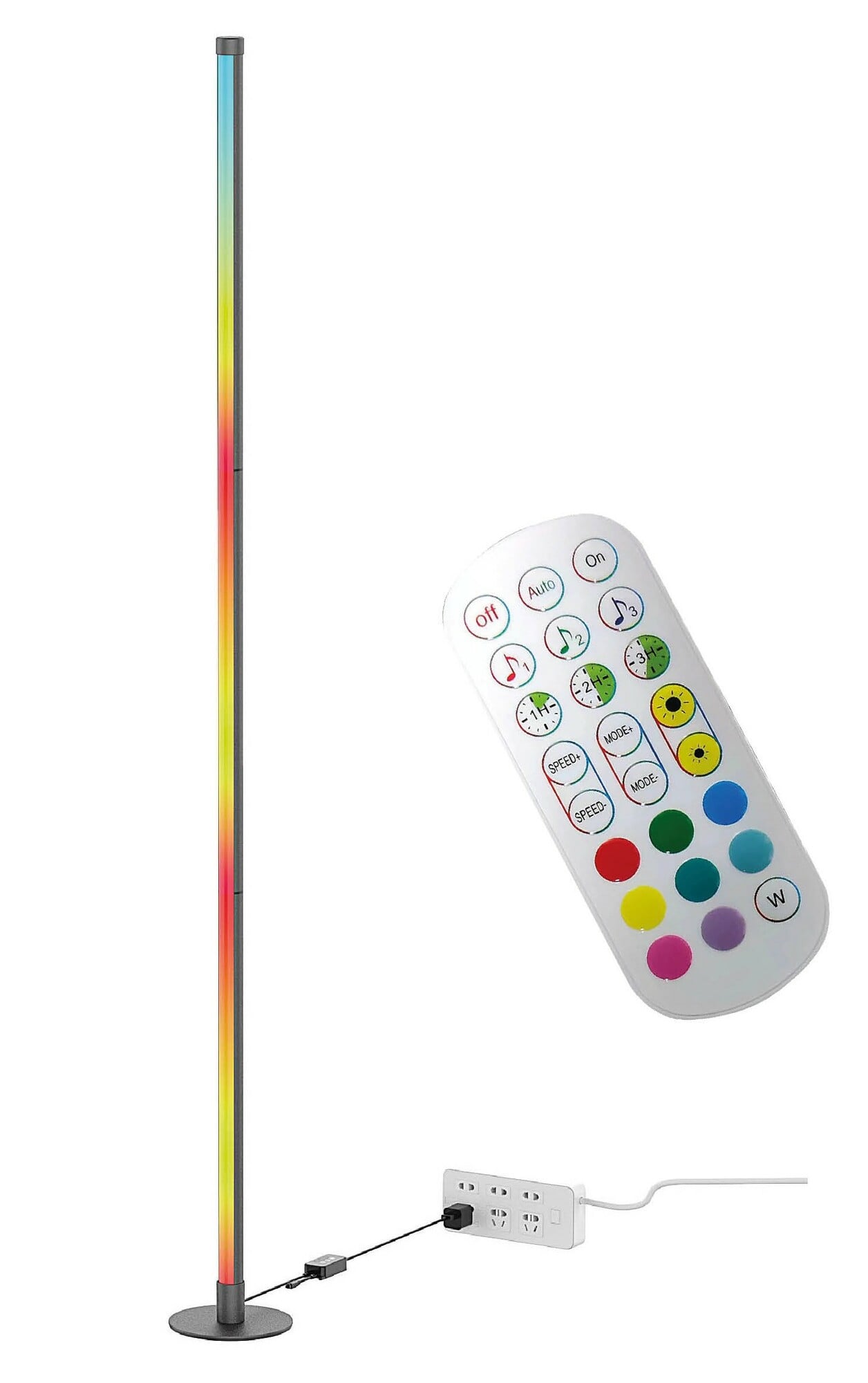 Gulvlampe med mulighet for å endre fargen på lyset, justere lysstyrken, blinke i takt med musikk og flere funksjoner.