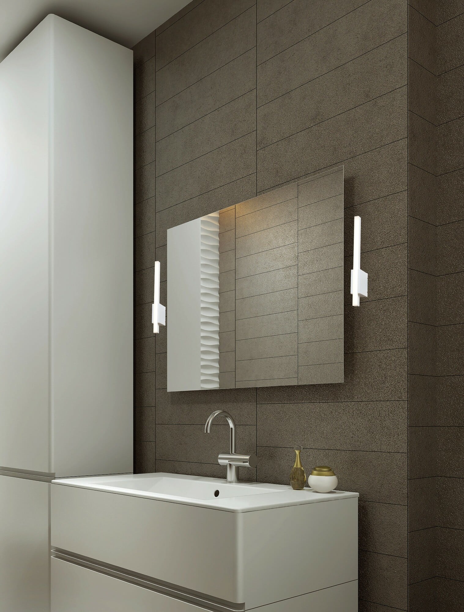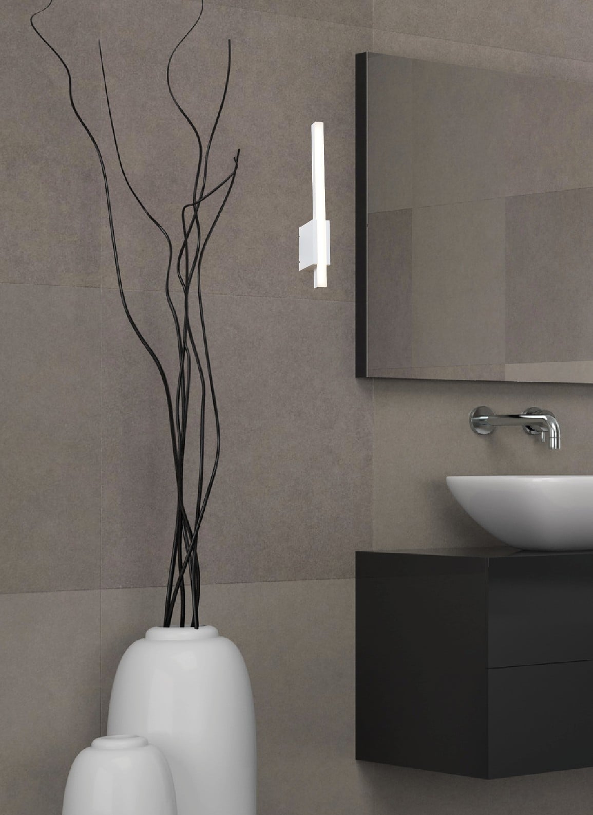 Elegant vegglampe som kan benyttes på baderom ved speil. Alt lys rettes ut fra veggen.