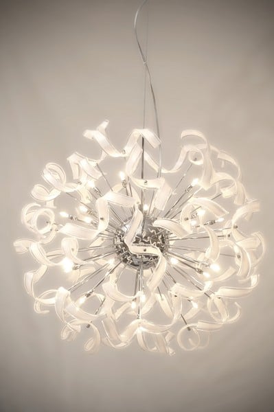 Dekorativ lysekrone med hvite glasstaver. Passer perfekt over spisebord og i trappoppgang.