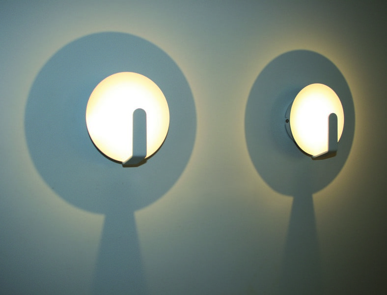 Kreativ lampe med indirekte lys. Lyset er plassert på armen og retter lysstrålen mot fronten som lyses opp. Kan benyttes i tak og på vegg.