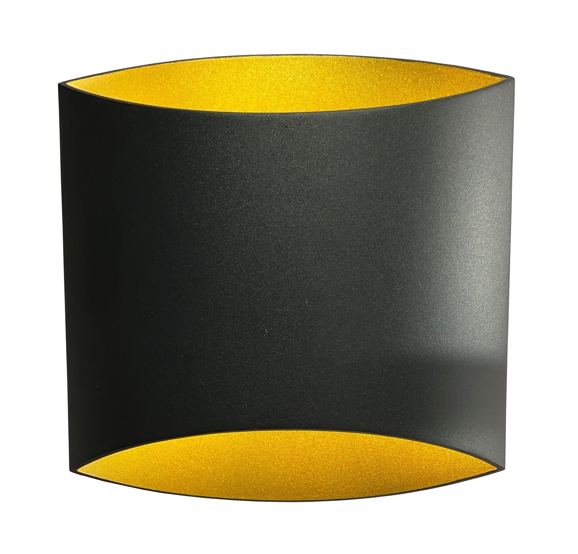 Dekorativ vegglampe i sort utførelse med gull innside. Innsiden lyses elegant opp og skaper et blikkfang i rommet.