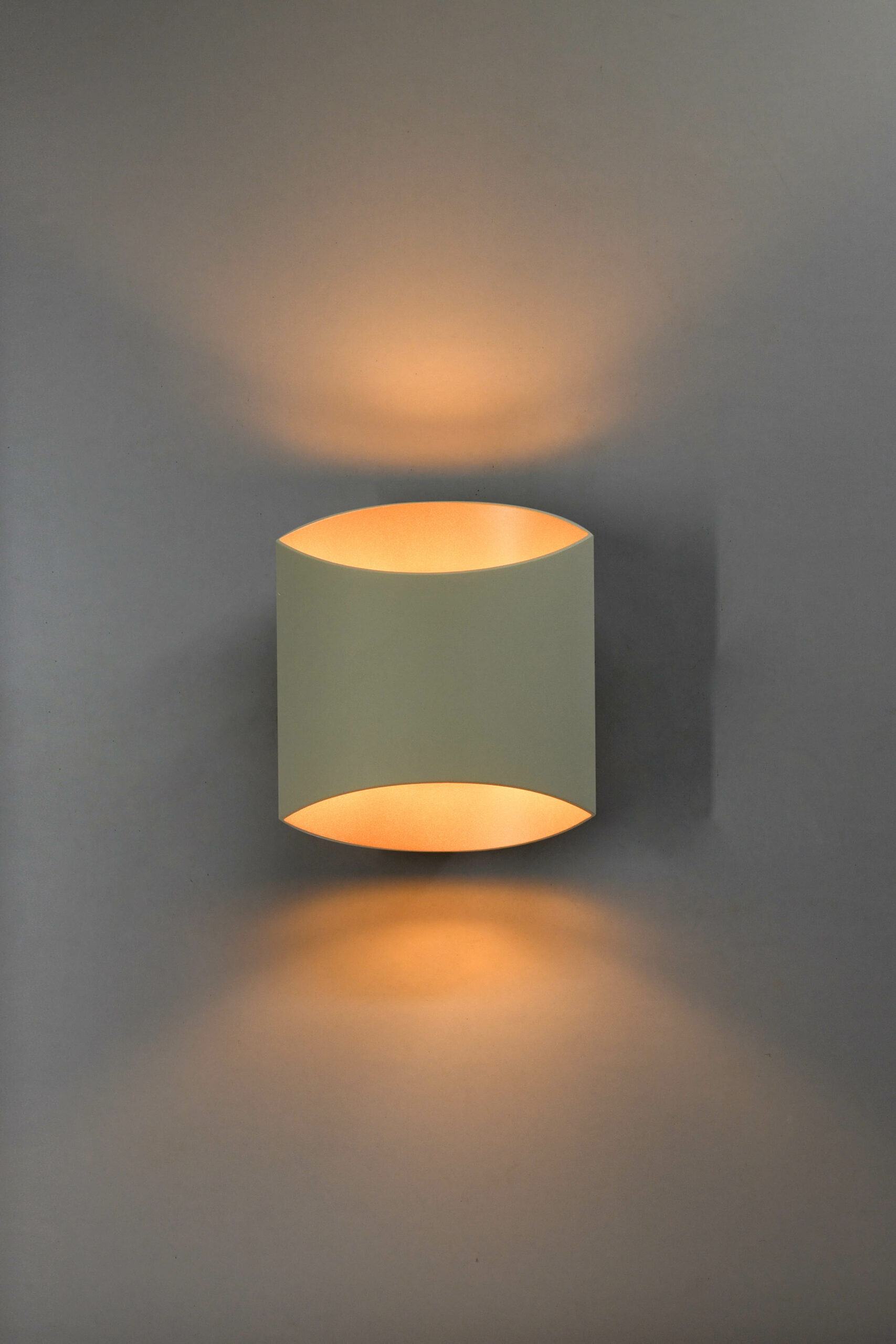 Dekorativ vegglampe i silk grey utførelse med gull innside. Innsiden lyses elegant opp og skaper et blikkfang i rommet.