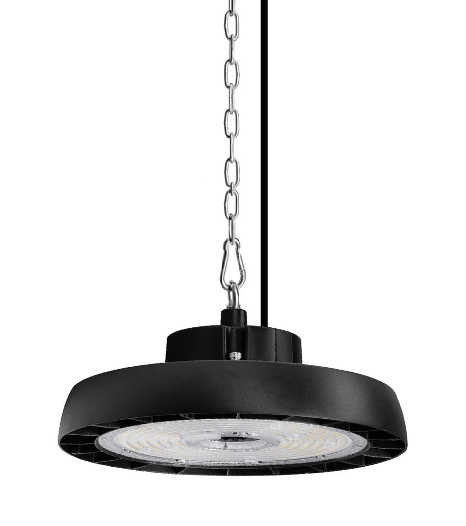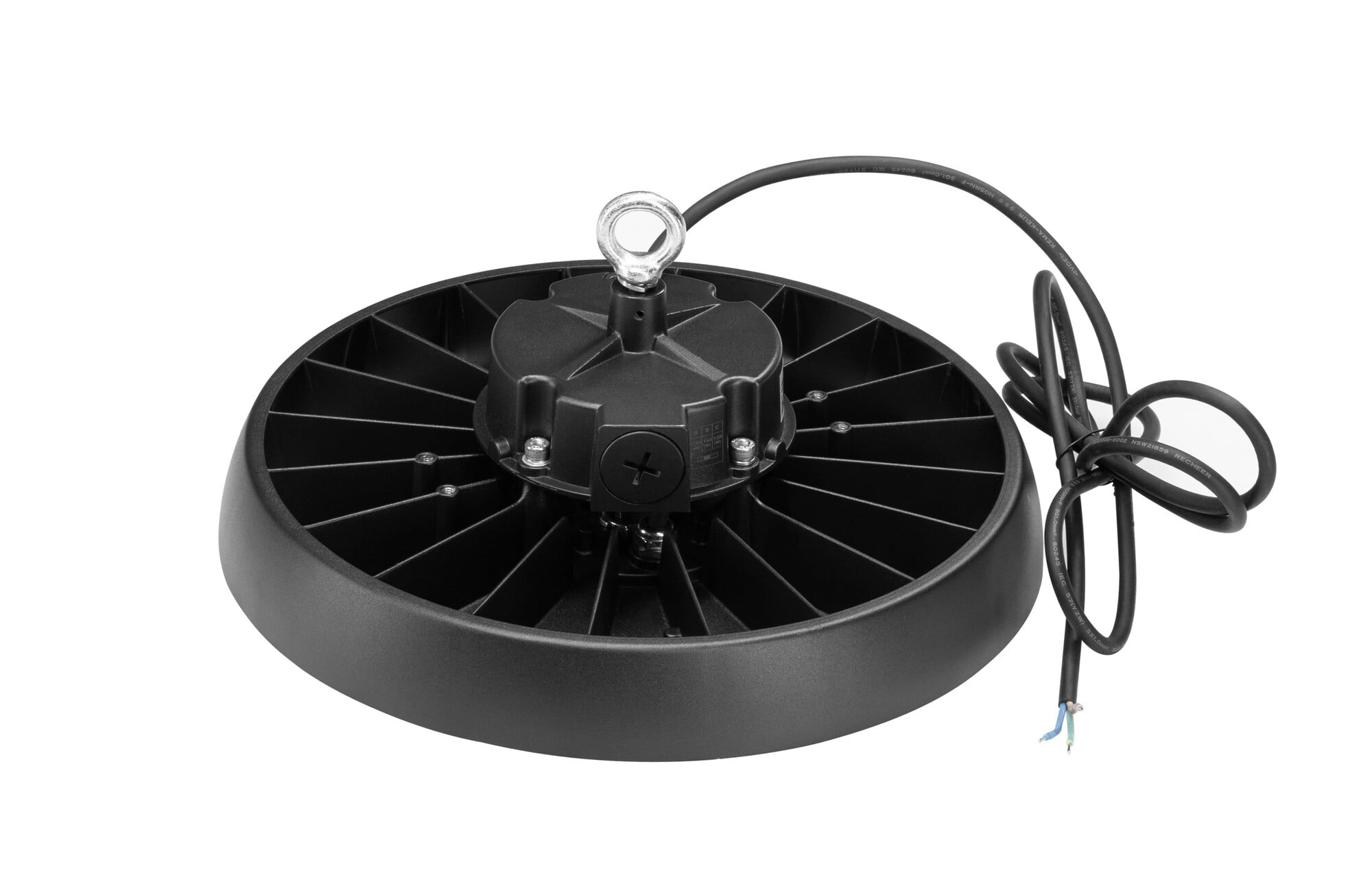 UFO High Bay er en lyssterk armaturserie med opp mot 180lm/W. Kan enten monteres nedhengt med kjetting eller fastmontert til underlaget med festebrakett. Ved montasje med festebrakett, kan den monteres på vegg og i tak, hvor den også kan tiltes.