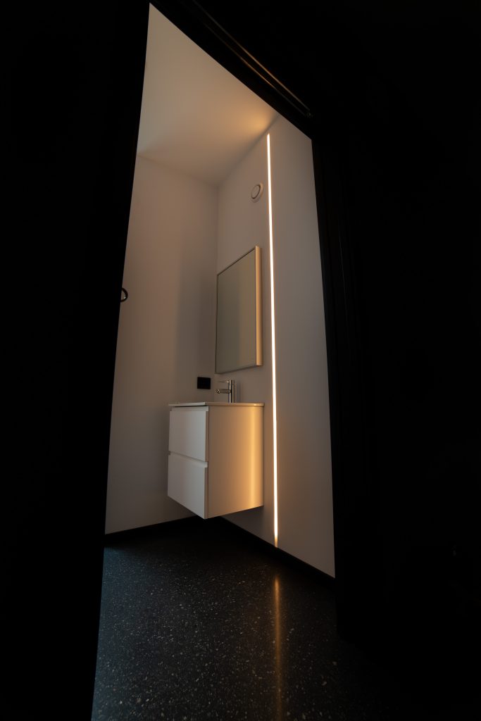 Flott funkisbolig i Ålesund med elegante belysningsløsninger. Her har det blitt benyttet downlight av typen Dakota, som kan tiltes 30 gr. i to retninger på den horisontale akse. Dette gir stor fleksibilitet i justering av lysretning. Trappelyset gir et behagelig lys og gir en elegant belysningseffekt som fremhever trappetrinnene. Innfelt LED strip på badet er et spenstig innslag, som stadig blir mer populært. Her er LED stripen innfelt i veggen, fra gulv til tak.