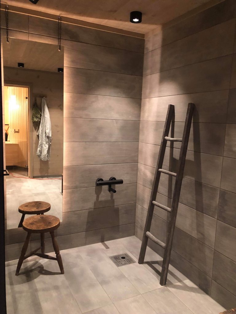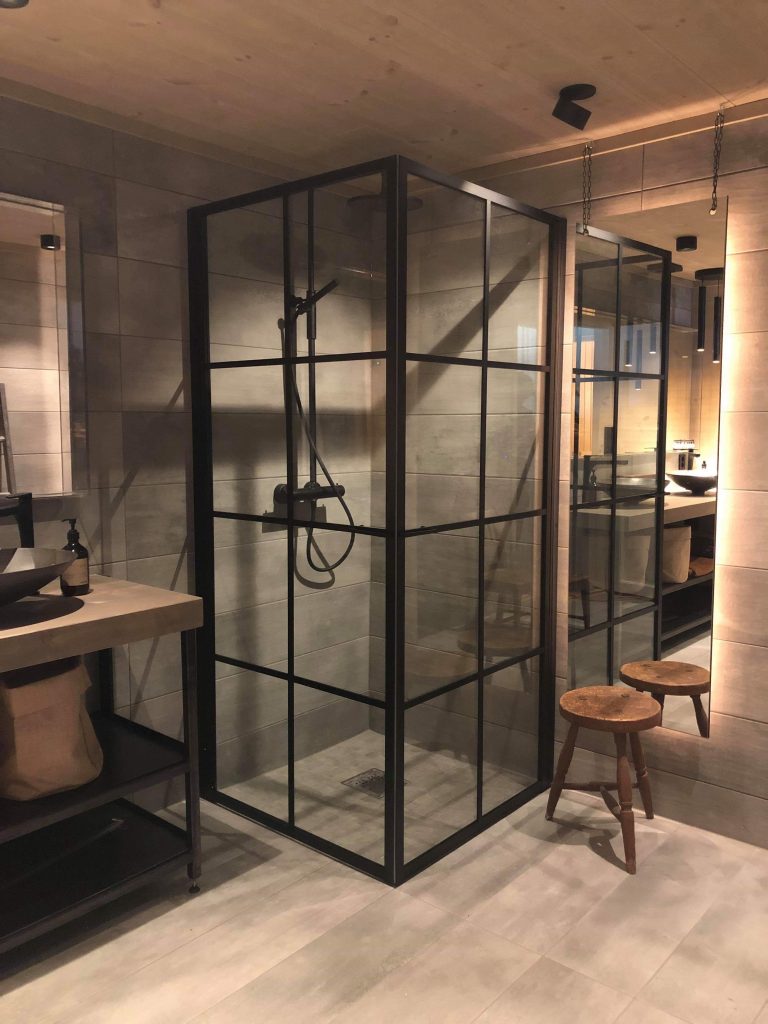 Elegant bad med sorte detaljer. Her har det blitt benyttet pendler over servant, hvor høyden enkelt kan reguleres, «semi-innfelte spotter i taket, som kan tiltes og roteres, og en flott LED-stripløsning, hvor LED-strip er plassert på baksiden av speil.