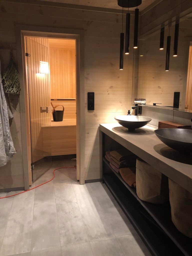 Glow (innfelt takspot), JP (pendel over servant), LED-strip (bak speil)