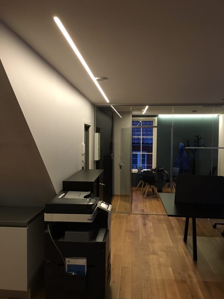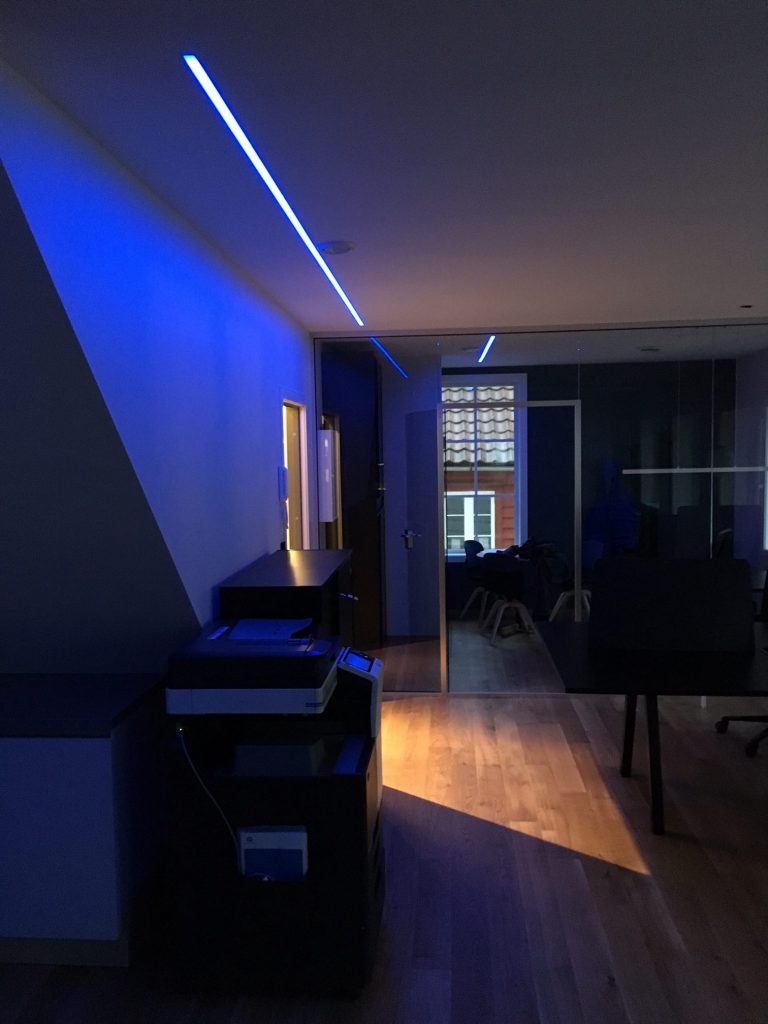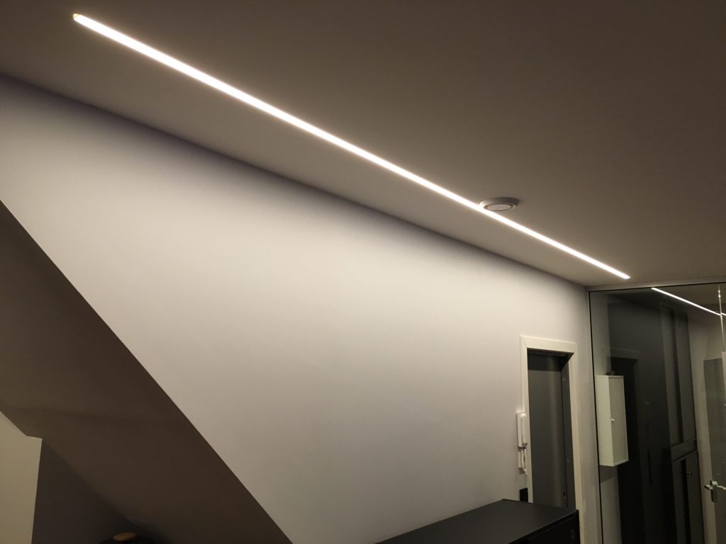 Elena (vegglampe), LED-Strip 14,4W/m og LED-Strip RGB med profil Teknik /Lokom (innfelt i tak), Mundo 40 (pendel).