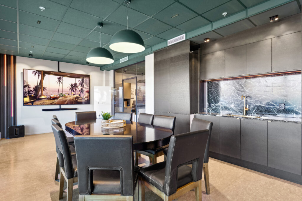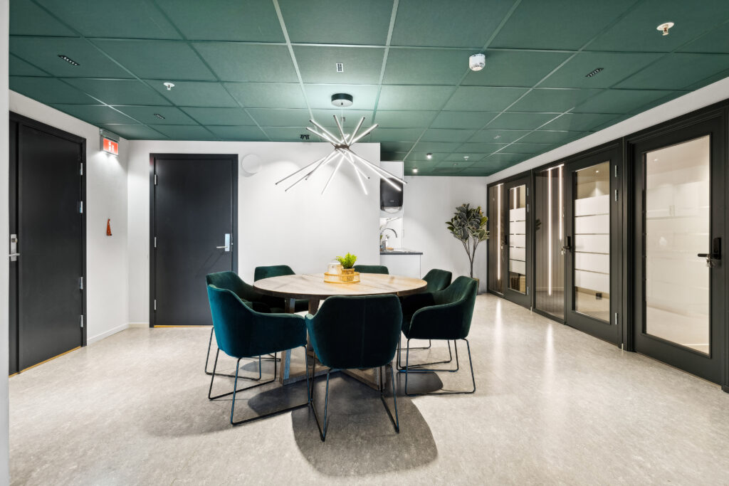 Nedhengte pendler over spisebord og møtebord (Amedeo og Cluster) skaper et blikkfang og gir rommene helhet.