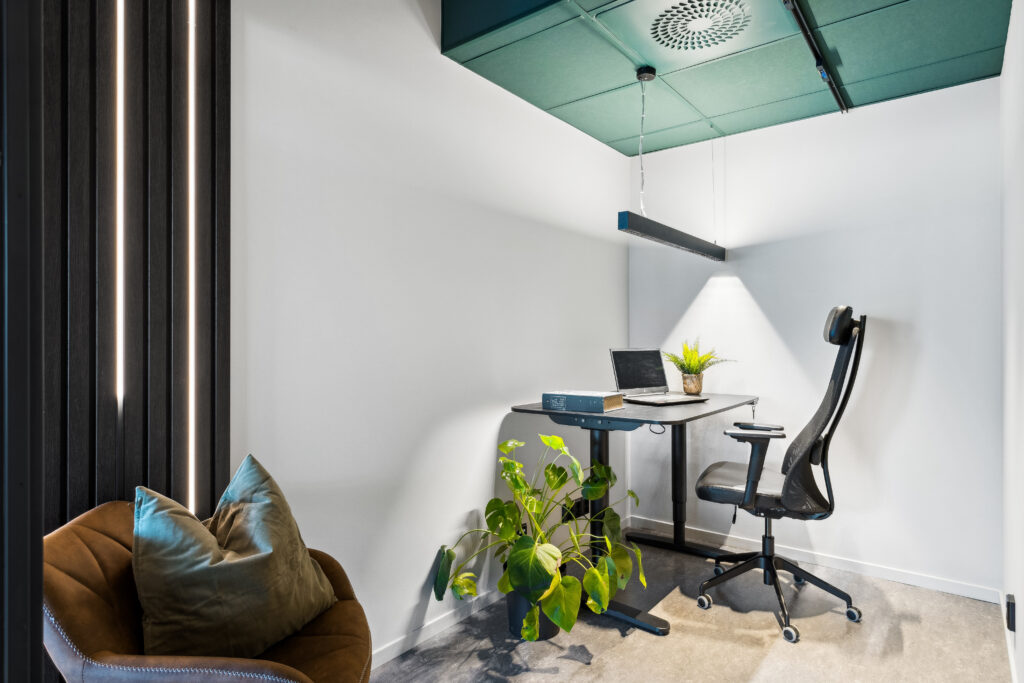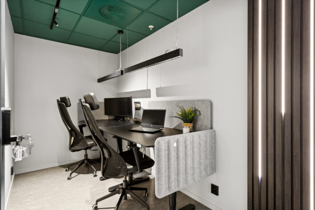 Over arbeidsplass er det benyttet nedhengt armatur (Maxime) som gir både opp- og nedlys.