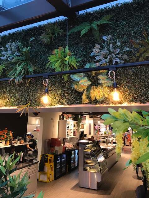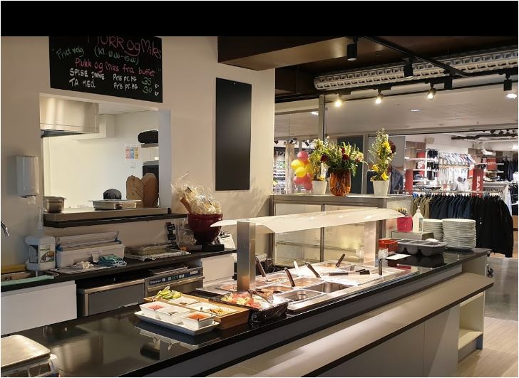 Her har det blitt levert belysning i sort utførelse i hele lokalet, noe som gir en meget flott og gjennomført opplevelse. Her har det blitt benyttet skinner (Global Trac Pro) med sorte spotter (Arietta 2700K) og pendeladaptere med sort ledning/pæreholder med store LED filament lyskilder (Ø125mm). På kjøkkenet har det blitt benyttet X-Panel (60x60cm). Dette har IP54, noe som gjør det til et foretrukket valg på restaurantkjøkken og lignende.