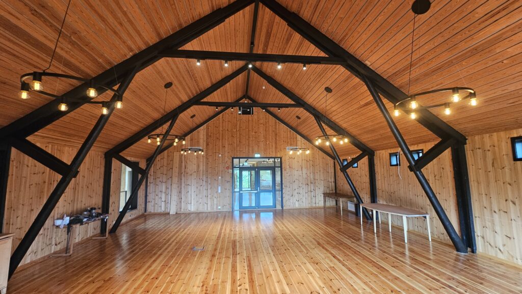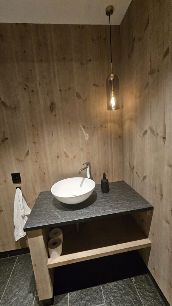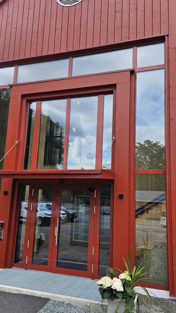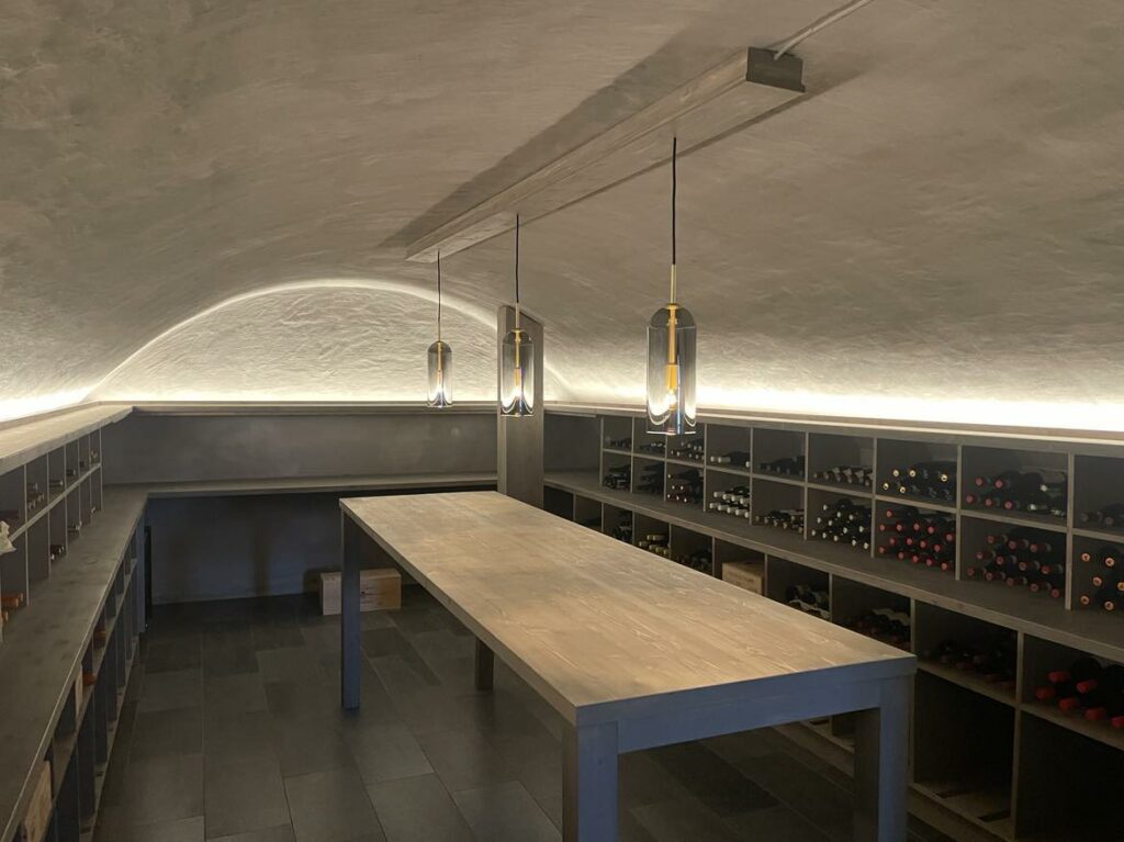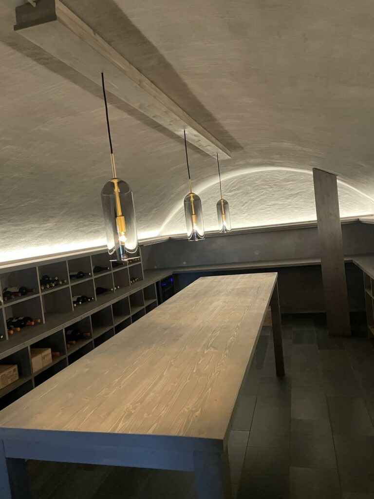 I entreen henger det en flott glasspendel med individuelle glasskuler i ulike størrelser. Dette skaper et blikkfang fra utsiden og passer perfekt med den store takhøyden. Vinrommet er lekkert innredet med LED-Strip langs veggene og stilrene glasspendler over bordet i midten av rommet. I storsalen henger det seks stk. sorte sirkulære pendler med åpen lyskilde, som skaper et varmt og innbydende miljø.