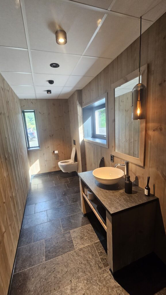 I entreen henger det en flott glasspendel med individuelle glasskuler i ulike størrelser. Dette skaper et blikkfang fra utsiden og passer perfekt med den store takhøyden. Vinrommet er lekkert innredet med LED-Strip langs veggene og stilrene glasspendler over bordet i midten av rommet. I storsalen henger det seks stk. sorte sirkulære pendler med åpen lyskilde, som skaper et varmt og innbydende miljø.